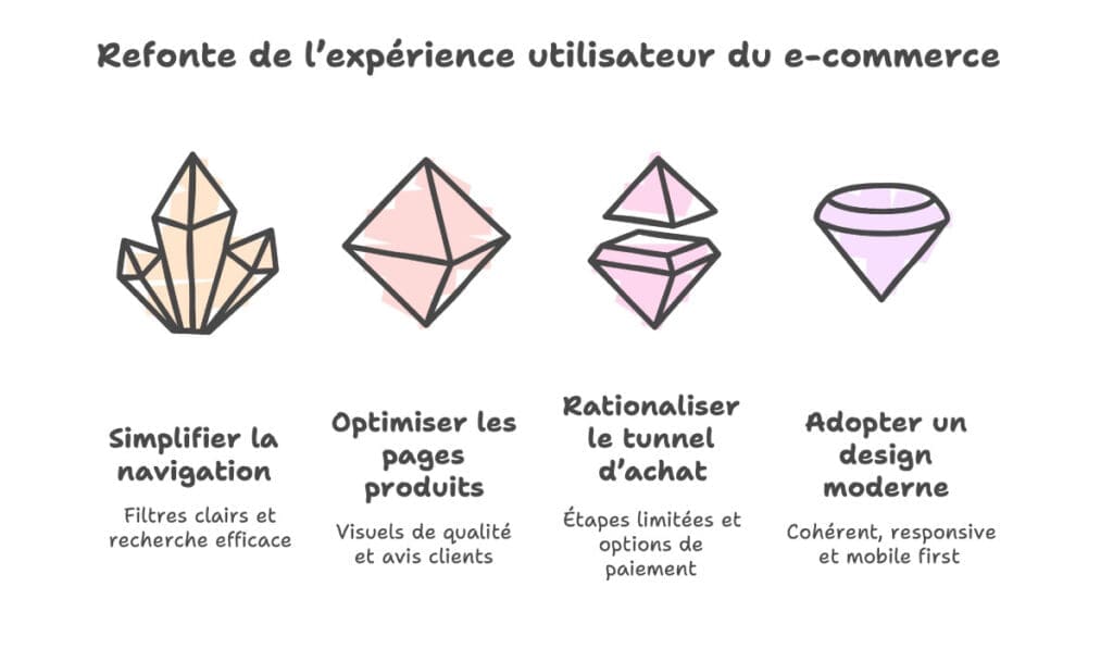 L’expérience utilisateur de votre ecommerce est le cœur de votre site. Une refonte doit donc s’attacher à simplifier la navigation pour que chaque client trouve rapidement le produit qu’il cherche. Des filtres clairs, une recherche interne efficace et une arborescence intuitive réduisent les frictions et accélèrent le parcours d’achat.
